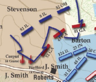 Suddenly, John Stevenson’s Illinoisans and Ohioans burst from a strip of timber and came in full view of the Confederate gunners posted on a hill above them. The six guns unleashed shot and shell into the exposed Federals. However, they could only do so much. Stevenson’s Federals overlapped the pieced together line and scattered the supporting Georgia infantry. With their infantry support gone, the gunners never stood a chance.