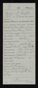 George and another of his brothers, Thaddeus, took their opportunity to join the Union war effort in December, 1863. The duo ended up enlisting in Company A, 56th Massachusetts Infantry. They both received a $25 bounty for their enlistments. George was twenty-five, and his muster record notes he had gray eyes, sandy hair, a dark complexion, and stood 5’8”.[5]