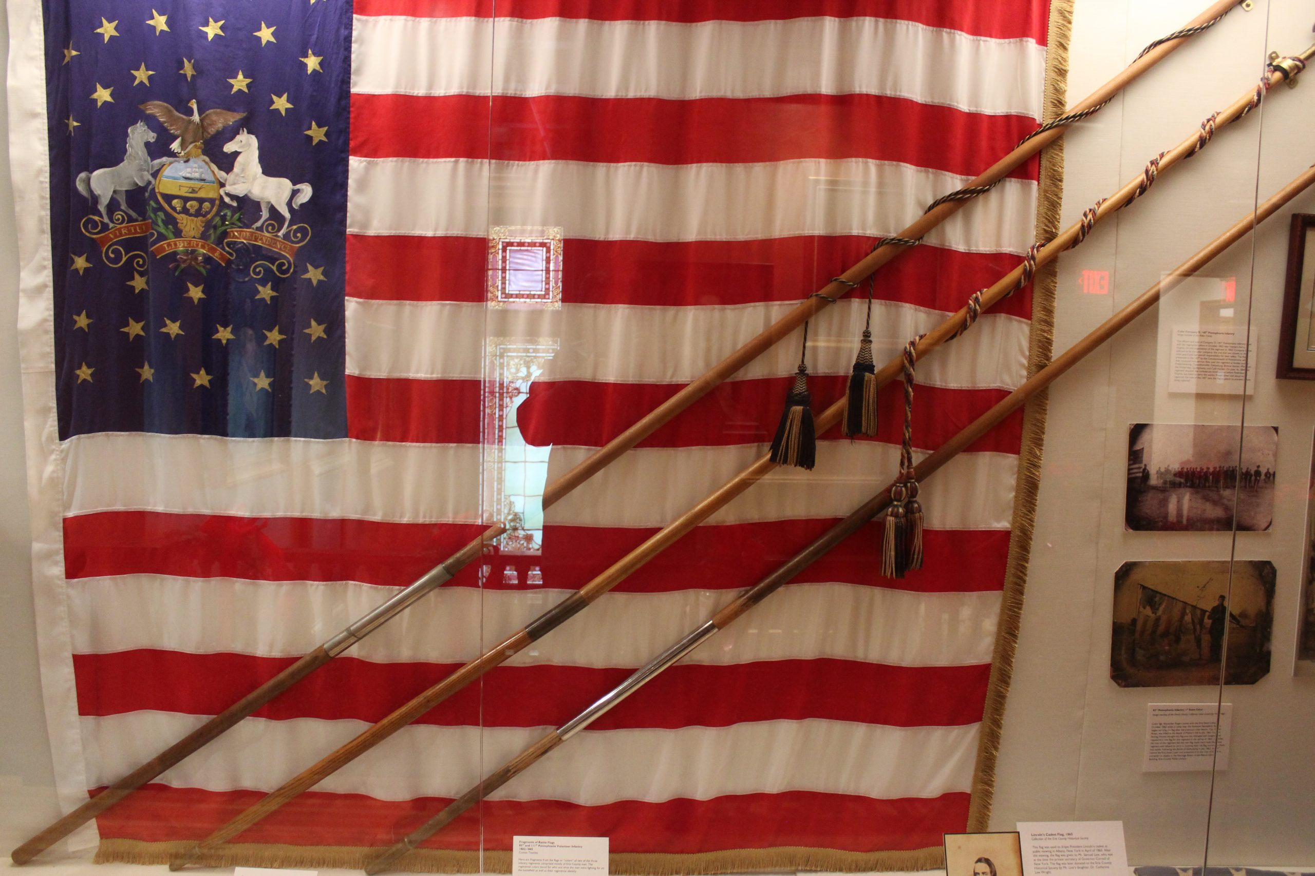 I was on the hunt for a couple of books that I was hoping that they would have in their gift shop, and a full serving of Strong Vincent and Erie’s Civil War history. I was pleasantly surprised at how nice the permanent exhibit on the second floor of the mansion is. The giant exhibit case outside the Civil War Gallery included the flag staffs of all three Erie Regiments, the 83rd, 111th, and 145th, the full flag behind is a reproduction for display purposes, as well as other artifacts.