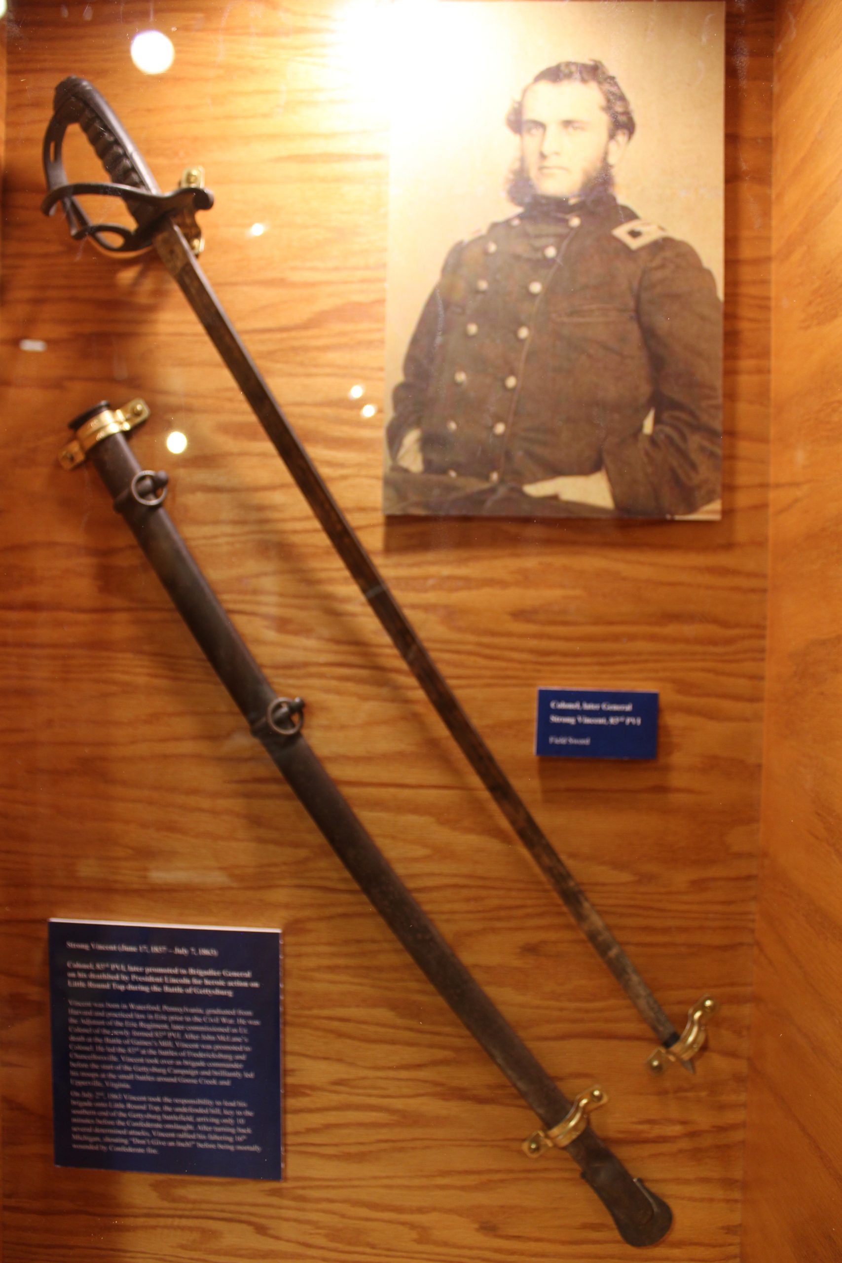 The gallery room is full of artifacts, including full uniforms, and also tells the stories of men from the Erie area who joined other units, including various artillery and cavalry units, as well as enough African-American men who ended up being a part of the 26th USCT. The prized piece in the room as Strong Vincent’s Field Sword.