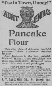 Inspiration struck Chris when in the fall of 1889 a vaudeville team called “Baker and Farrell” came to St. Joseph to perform. Baker’s most popular song was called “Aunt Jemima,” and before long the whole town was singing it. Chris Rutt decided that “Aunt Jemima” was the perfect name for his new pancake mix, since the name conjured up visions of a plump, matronly lady cooking piles of steaming pancakes and waffles. Unfortunately, Chris and his associates couldn’t raise enough money to promote their Aunt Jemima flour, so in 1890 they sold their formula to the R.T. Davis Milling Company.