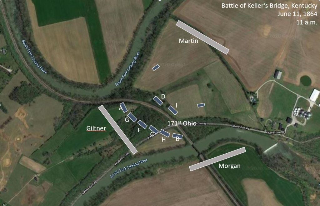 General Hobson deployed his men in a precarious spot within an oxbow of the South Fork of the Licking River. By stopping the train so close to Keller’s Bridge, Hobson’s Federals walked neatly into a trap which Morgan’s cavalrymen rushed quickly to spring. With a total of 800 men under his command, Hobson (unknowingly) was confronted by nearly twice as many veteran Confederates. Colonel Asper had been ordered to detail 230 men to saddle the horses and get them off the train when he heard firing. It was the fight between the 168th Ohio and Morgan’s command. Hapgood reported “they were soon captured, and between 5 and 6 o’clock [a.m.], a portion of the 47th Kentucky which had been sent out as skirmishers on foot came upon a party of Rebels each with a number of horses in charge, their riders having dismounted to follow the bushwhacking style of fighting. They immediately gave them a volley, scattering them in all directions.” [7]