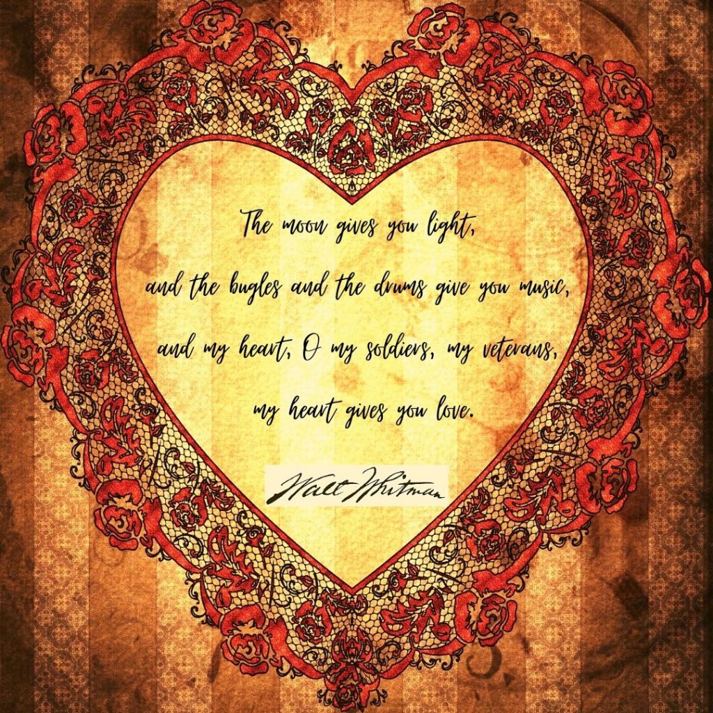 Happy Valentine’s Day! Here is a valentine card from your Uncle Walt, ready for printing and giving to all those near and dear—or not. The excerpt is from Whitman’s poem, “Dirge for Two Veterans,” which will be featured next Sunday. Happy Valentine’s Day, one and all.
