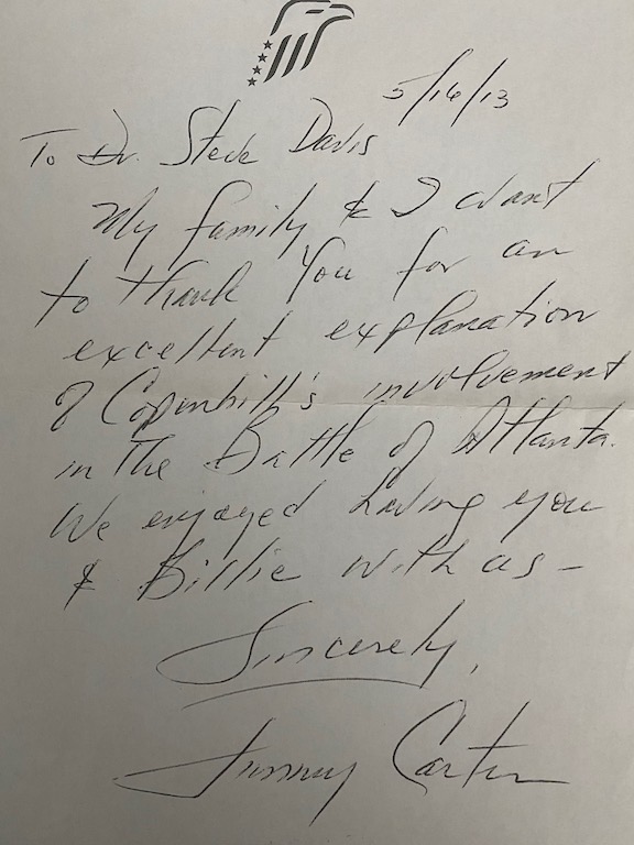 When called upon I began my talk—rather briskly, mind you, as I was a little nervous. Jimmy and Rosalynn, though, put everyone at ease. I was impressed by the President at one point inserting that the Federals’ twisted rails had been called “Sherman’s neckties.” At another point, when I said that as Sherman was fixin’ to march to the sea, Rosalynn broke into gleeful laughter. “Steve, in the old days when we held social functions, I would walk about, listening for the word fixin’—when I heard it, I knew I could talk with a true Southerner.”
