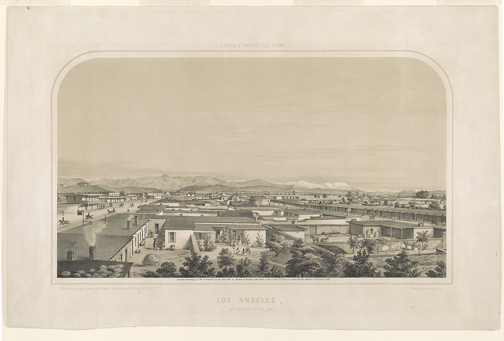 The Los Angeles of 1861 was vastly different from the sprawling urban center of the 21st Century. Mrs. Hancock, wife of Captain Winfield S. Hancock who was stationed in the town, gave a glimpse of the scene in her writings, recalling: “then it boasted of 4,000 [residents]. Its main street was lined on both sides with adobe houses of true Spanish type, and not very many of them; but the surrounding country, with its beautiful hills and valley, its snow-capped mountains and variegated fields, was unsurpassingly charming.” The majority of the citizens were of Spanish or Mexican descent, practicing Catholicism. Some Native Americans had assimilated into the local community while others preferred to live with their tribes and visited the Hancock’s home and quartermaster depot on forced diplomatic endeavors.
