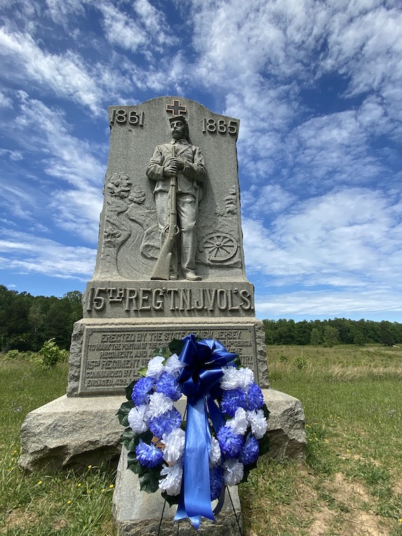It was a beautiful day at Spotsylvania Courthouse yesterday on the anniversary of the battle—quite the contrast from the pouring rain of 1864. Someone had brought a wreath to commemorate the action of the 15th New Jersey Infantry, whose monument stands on the Unions side of works at the Bloody Angle.