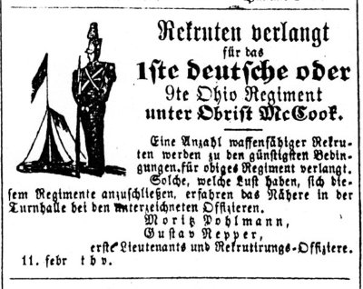 Cincinnati’s German American community responded to the news of the surrender of Ft. Sumter and President Lincoln’s call for troops with unbridled enthusiasm. Handbills posted the evening of April 14, 1861 on the wall at Turner Hall on Walnut Street included a signup sheet for volunteers. Hundreds enlisted that same evening. Gustav Tafel, leader of the local Turner Society, and August Willich, founder of Cincinnati’s German Workingmen’s Society held rallies that week and recruited four companies each. In no time, the ranks of the Ninth Volunteer Infantry, Ohio’s first all-German regiment, overflowed far past the 1000-man target. This was hardly surprising to anyone who lived in the Over-the-Rhine neighborhood where most recent Germanic immigrants resided. Most of these men anticipated war against the still-forming Confederate States and had been conducting military exercises for months.[1]