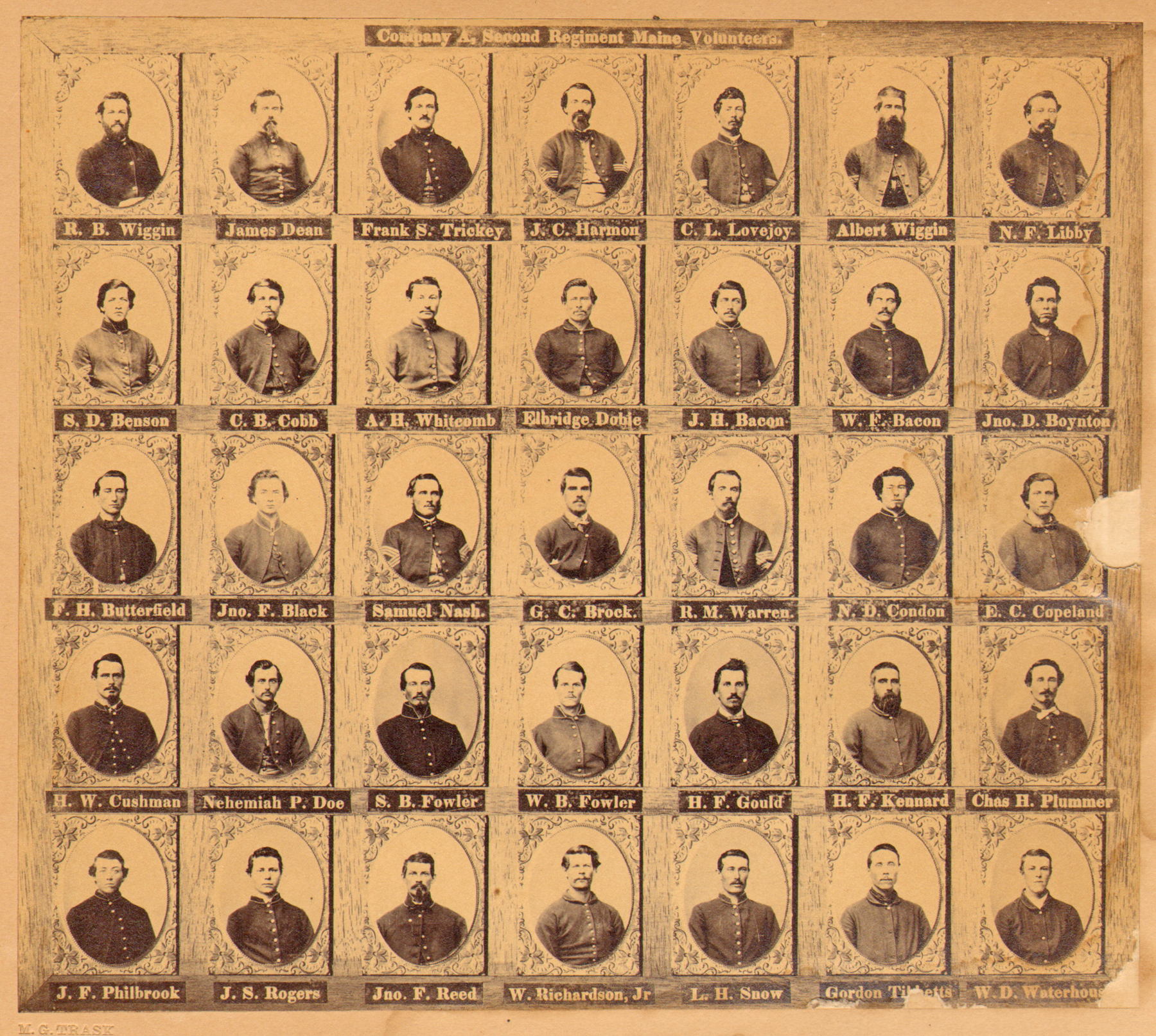 Before the 2nd Maine Infantry Regiment left Bangor, Maine for Washington, D.C. on May 14, 1861, many members of Co. A posed for individual photographs. These were incorporated into a larger image resembling a page of postage stamps. (Bangor Historical Society)