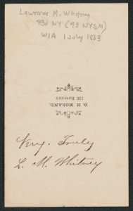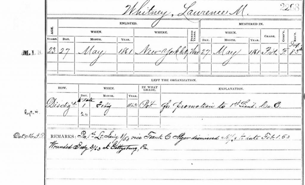 His name was Lawrence M. Whitney, and he had promoted to lieutenant in Company E in the 83rd New York Regiment. He was wounded during the Battle of Gettysburg.