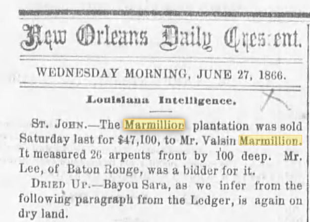 [14] “Louisiana Intelligence, St. John,” New Orleans Daily Crescent, New Orleans, LA, June 27, 1866. “The Marmillion plantation was sold Saturday last for $47,100 to Mr. Valsin Marmillion.”