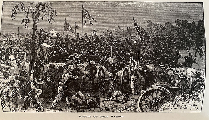 For one imaginative pictorial take on the battle, there’s Alfred Waud’s “Battle of Cold Harbor.” The drawing appears in Joseph T. Derry’s Story of the Confederate States (Richmond, 1895). Take a look:
