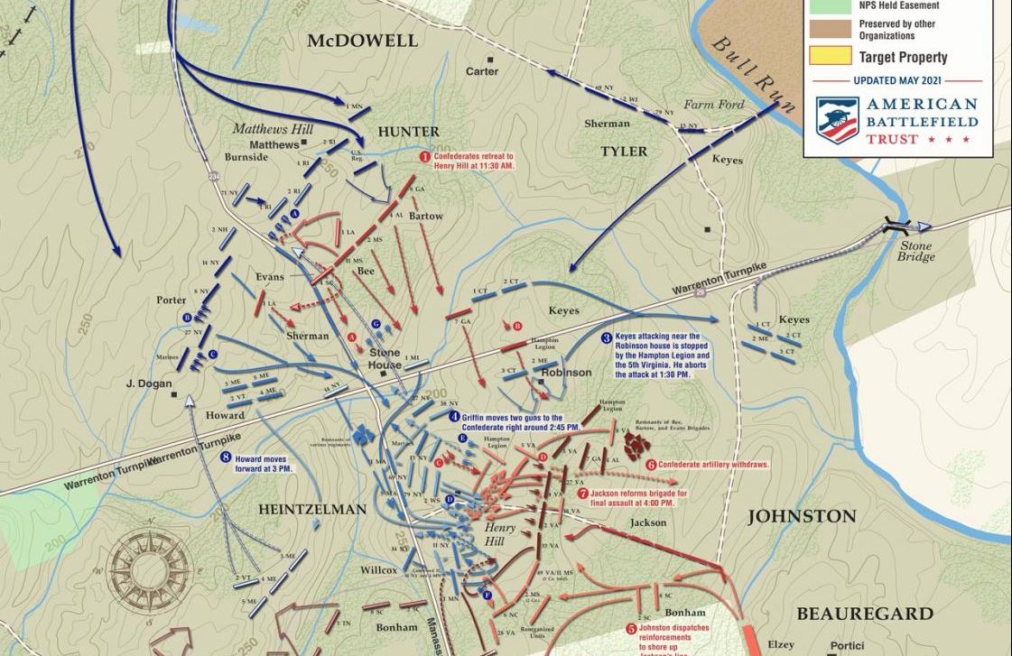 Bee’s first position is visible on Matthew’s Hill. His second position is the mass of red at the right of Jackson’s line [American Battlefield Trust Map, cropped]