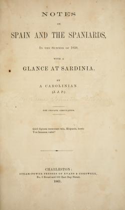 The answer is, Notes on Spain and the Spaniards in the Summer of 1859, With a Glance at Sardinia. Published in 1861 by the Presses of Evans and Cogswell of Charleston, South Carolina upon his return from a second venture to Europe.