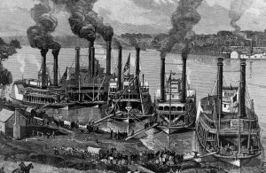 Railroads had been advancing west but low-powered locomotives on single tracks along limited networks could not compete with steamboats in carrying capacity or area coverage, and they were vulnerable. “I am never easy with a railroad” wrote Sherman, “which takes a whole army to guard, every foot of rail being essential to the whole; whereas they can’t stop the Tennessee [River] and each boat can make its own game.”[6] On another occasion: “The Mississippi boats were admirably calculated for handling troops, horses, guns, stores, etc., easy of embarkation and disembarkation, and supplies of all kinds were abundant. . . .”[7]