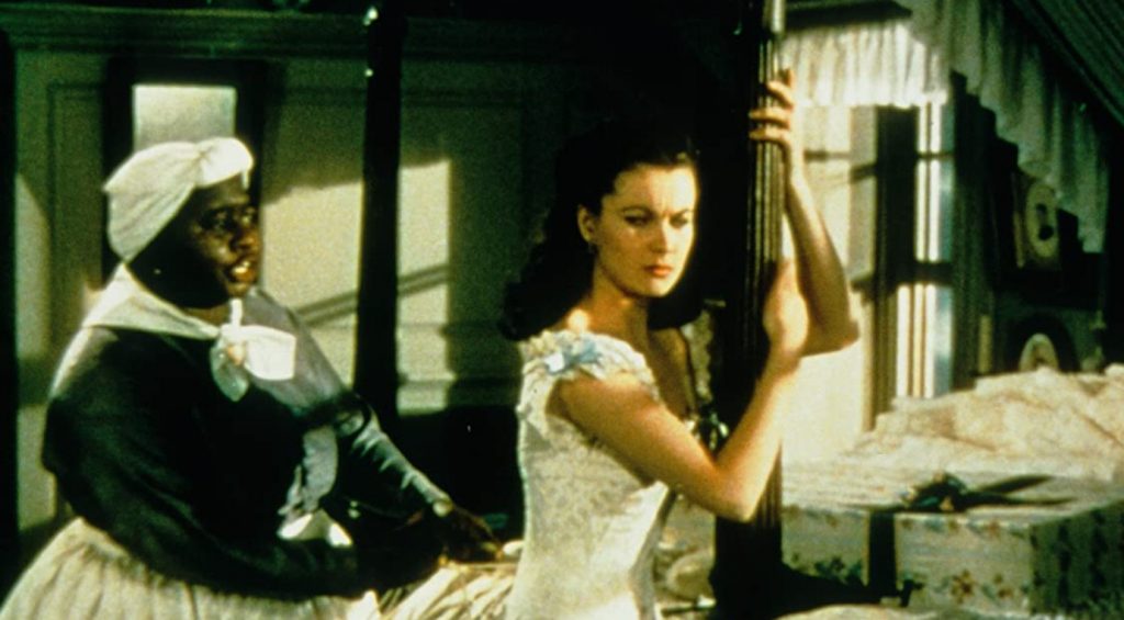 Much has been written about the differences between the book and the movie. Even Mitchell herself recognized and was somewhat disturbed by some of the film choices. In the 1861 section, Mitchell highlighted the challenges for white women in the plantation system—from managing the land, overseers, and enslaved to the hypocrisy of being a dainty lady to “catch a husband.” She wanted to portray north Georgia, not the white-pillared plantations of other southern regions. Mitchell had her share of prejudices and Lost Cause influences, but Hollywood took it to new levels and helped to solidify a lot of myths even in just the open minutes of the film. Some of the iconic scenes and witty dialog happen in the 1861 period of the movie against the backdrop of plantation settings. The white pillars, “happy slaves,” dapper gentlemen, and the frilly dresses of Hollywood gave a visual “reality” to myth and created a persistent image of the antebellum south.