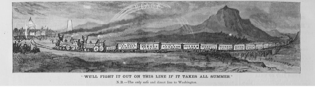 The western progress of the railroads and the army forts built to protect their constructors, were a direct result of Union victory in the Civil War. To be sure, railroads were a continual topic of conversation in the antebellum federal government and, as Secretary of War, Jefferson Davis had four potential routes surveyed in the early 1850s, but, after the Civil War, they symbolized the triumph of free labor over slavery—and the flourishing of capitalism in the West. And the media celebrated them and the men who made them possible. In Harper’s Weekly, peace arched over the railroad and text from Ulysses S. Grant’s famous utterance from the Overland Campaign underscored the degree to which Americans viewed unchecked western expansion as a right they had won by triumphing over the Confederacy.