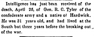 But I kept up my interest in Tyler. And the advent of online digitalized newspapers enabled new resources and searches to be made. Imagine then my surprise when four years ago I ran across this item in an 1865 Massachusetts newspaper: