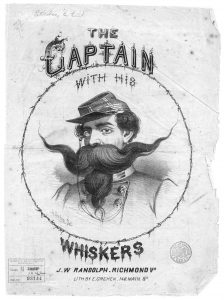Songs from both sides also had some fun at the girls’ expense, describing civilian reactions to soldiers marching through a community. The second verse of Johnny is My Darling reads: “As he came marching up the street, The bands played loud and clear; And everyone came out to greet, The Union Volunteer.” The narrator in the lyrics predictably falls in love with this certain volunteer and promises to be lonely until the soldier “returns to me again as Cupid’s Volunteer.” The Captain With His Whiskers seems to predate the Civil War but was sung in the period. (This piece is not in Silber’s collection, but is noteworthy.) This comic song also has lyrics with a female narrator, starting with: “As they marched through the town with their banners so gay, I ran to the window just to hear the band play, I peeped through the blinds very cautiously then Lest the neighbors should say I was looking at the men…” Of course, The-Captain-With-The-Whiskers sees the girl and takes a “sly glance.” The lyrics ramble on for several funny stanzas as the girl and the captain meet at a ball, fall in love, and he eventually returns from the war to marry her. While approaching military/civilian interactions with humor, these songs do reflect reality of a regiment marching through a friendly community and “enlisting the hearts.”