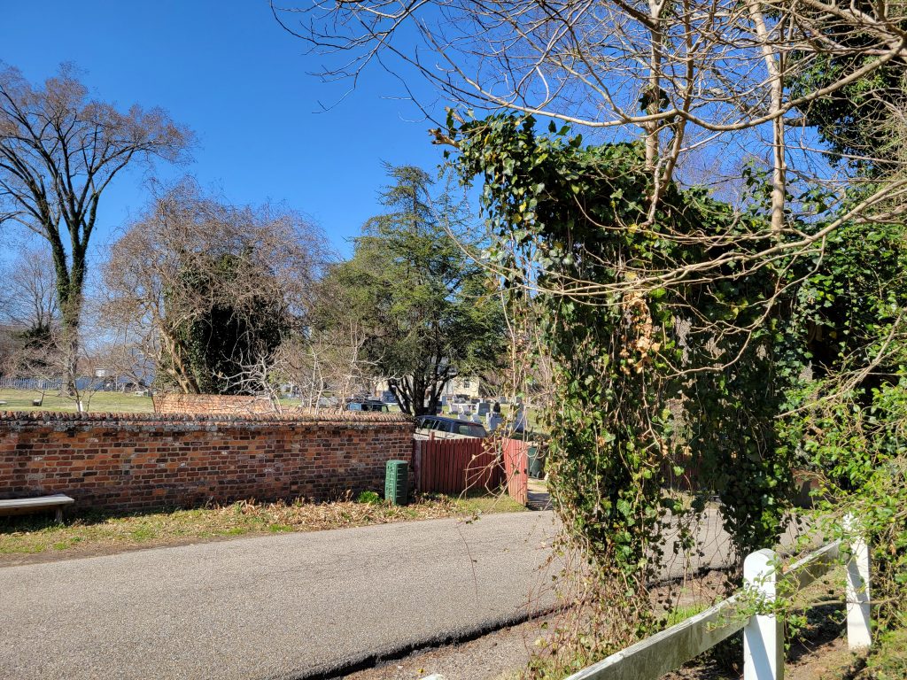 Photography Notes: The Civil War image is taken at a distance and to attempt to recreate it started with trying to get the correct angle of the church building, using the original back corner. (See first image). Then I started backing up, moving through the cemetery toward Mobjack’s Coffee, then crossed a deep modern lane and stood near the corner to the take the second photo. (See next image) Thanks to the cemetery and the trees, the church is barely visible, but I think it’s close to the photographer’s original location. Which brings up the question…is the modern lane part of the remains of the military battery? There is also a fairly steep area a little closer to the church and cemetery that looks like the parsonage  parking/driveway. That might be the battery location since it would be a little closer to the church as seen in the original photograph. (I didn’t want to be prowling around private property or taking pictures of other people’s cars, so I headed across the road.) I haven’t found an answer yet, but the battery location should be in the vicinity.