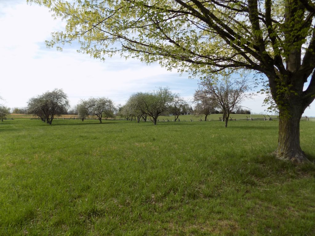 Moving from their reserve position, the VMI cadets rush toward the battle lines, hurrying along a downward slope and aiming their route to the white structures of the Bushong Farm. An artillery projectile killed and wounded some cadets as they moved toward the farm houses. Reaching the yard and houses, the corps split — two companies going to the left, the other two to the right of the Bushong House. According to cadet accounts, it seems that their unit came under rifle/musket fire around the Bushong house and certainly in the orchard as they rushed to their position along the north orchard fence.