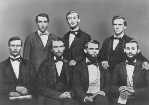 In 1855 the state of Michigan established the State Agricultural College in Lansing, MI. Today the institution is known as Michigan State University and boasts a beautiful and well landscaped 5,000 acre campus, home to almost 50,000 students who readily adopt the identity of their beloved sports teams—the Spartans. In 1861, however, campus consisted of three buildings, one of which was a barn built on a 200 acre field along the banks of the Red Cedar River. Hundreds of recently cut stumps speckled the clearing. The first students, known as “The Aggies,” cleared many of the trees themselves as part of a grueling daily work regimen. Classes formally began in 1857, and by November of 1861 the college was ready to graduate its first class.[1]