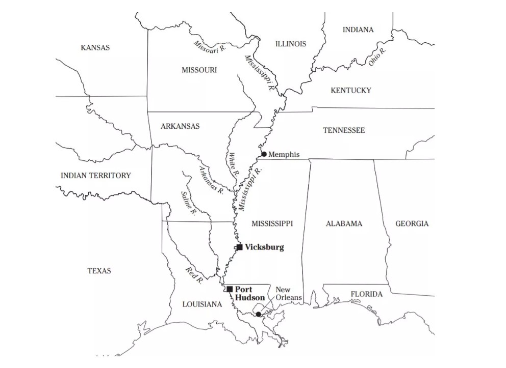 [14] Illustration 1: Strategic Significance of Vicksburg, map taken from R. E. Lee’s Grand Strategy and Leadership by JoAnna McDonald.  Savas and Beatie Publications, El Dorado Hills, CA.  Date: TBD.  Illustration 2: Steamboat, https://shiphistory.org/2021/02/26/steamboats-enslavement-and-freedom/.  Illustration 3: Mississippi: Backbone of the Rebellion, https://www.nps.gov/articles/the-siege-of-port-hudson-forty-days-and-nights-in-the-wilderness-of-death-teaching-with-historic-places.htm.  Illustration 4: Vicksburg, http://npshistory.com/publications/civil_war_series/24/sec9.htm.  Illustration 5: Captured cannon, https://mississippiconfederates.wordpress.com/2014/05/14/artillery-during-the-siege-of-vicksburg.