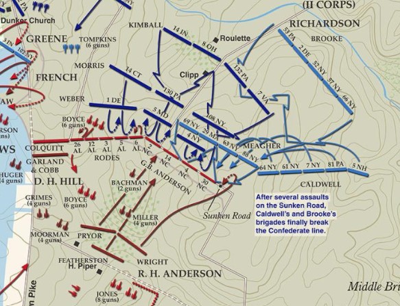 As Gordon had expected, the close-range fire was devastating. He later remembered the entire front line going down before his regiment’s volley. Along the Sunken Road, other Confederate regiments decimated the foes to their fronts as well.
