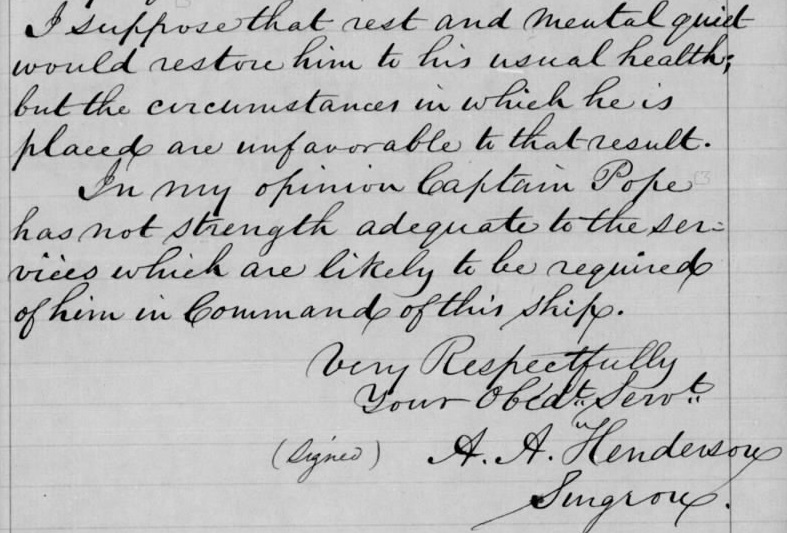 In this instance Surgeon Andrew Henderson was left to make the tough call alone. With such pressures, and with the career of one of the Navy’s most senior officers at stake, he ultimately recommended Pope’s relief. Based on the medical report, it very well could have saved Pope’s life and avoided a complete mental breakdown.