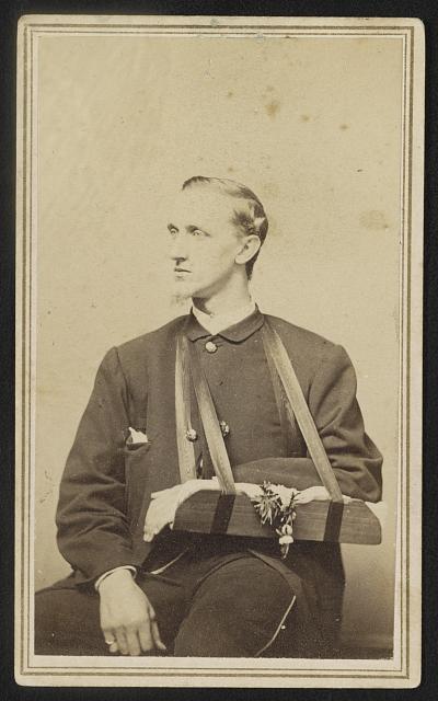 By early August 1863, Bartlett had arrived home to finish his convalescence. A photograph taken at that time shows his arm supported in a box sling. A bunch of flowers appears to hang from the splint/sling. Later, poet Herman Melville wrote about “The College Colonel”, painting a word portrait of the young officer and mentioning the conspicuous arm sling: