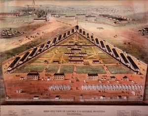 The experience at his brother’s camp in the Fredericksburg area moved Whitman to continue to aid “… this vast army of the wounded and the sick,” lodged at the hospitals in the Washington area. (29) Walt began his hospital visits on December 21, 1862, among the camp hospitals in the Army of the Potomac under General Burnside. The term “camp hospital” is a bit ambiguous. Generally speaking, there were two types of hospitals during the Civil War: field hospitals and general hospitals. Field hospitals were located near the front lines and served as an initial treatment center for soldiers evacuated from the battlefield. General hospitals were military hospitals either explicitly erected for the purpose or by the taking over of private homes, clubs, churches, school buildings, government offices such as the Patent Office, and hotels. These latter were where soldiers spent weeks or months attempting to recover. Camp hospitals were a type of field hospital built temporarily where the army had fought a battle and would be staying for a longer time than just a few days.