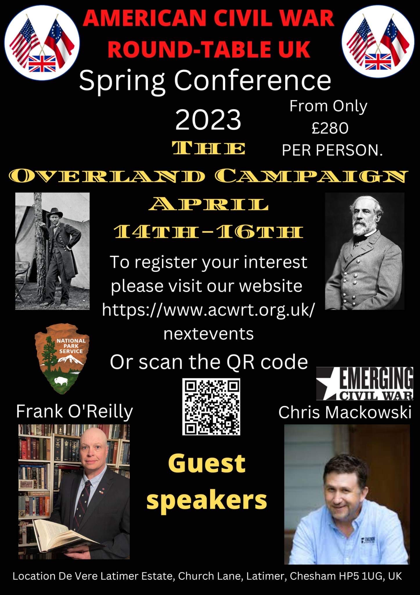I get to take my first-ever trip to England later this spring, and I couldn’t be more psyched! I’ve been invited to speak at the U.K.’s American Civil War Roundtable spring conference, April 14-16, 2023, in London. And super-exciting to me is that I get to be on the bill with Frank O’Reilly, a longtime friend and mentor and all-around good guy. We’ll be talking about various aspects of the 1864 Overland Campaign.