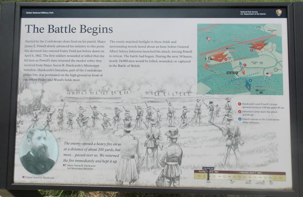 Between 4:55 a.m. and 5:14 near the Corinth Road, the soldiers of the 12th Michigan spied a horseman. Orders were given to fall back but then the cavalry opened fire. The battle of Shiloh had begun.