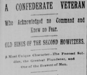 Hines’ records indicate that he became a prisoner on July 5, 1863, near Gettysburg, but the author claims it occurred “Towards the latter part of the war.” The author related that “’Old Hines’ was a great mystery to his captors.” A comrade nabbed along with Hines allegedly told the author that the old man would “not tell what company, battalion, regiment, or corps he belonged to, because he never knew.” According to the author, Hines never took the oath of allegiance, while others did “to avoid the horrors of prison.” Hines though “remained true to his colors.” As mentioned above, Hines’ service records are unclear on whether he was exchanged or not. The author ends the article by stating that, concerning Hines, “it may be said there never was a poorer soldier, a greater plunderer, or a braver man.”