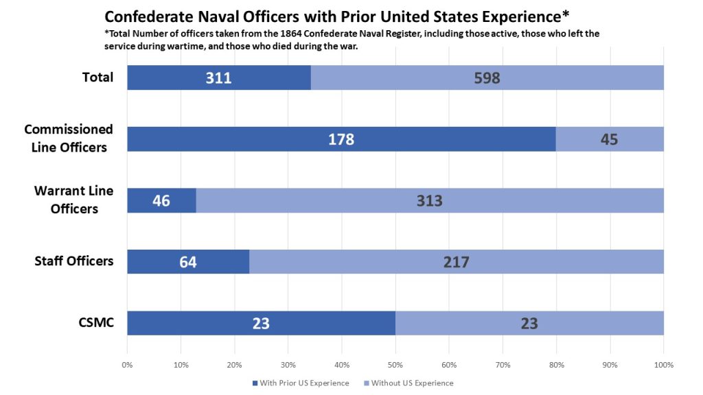 The Confederate Navy was a small organization, numbering 5,213 at its peak in 1864.[3] Less than 1,000 men served as officers in the CSN/CSMC throughout the war. Of those, approximately 35% held antebellum experience with the US Government. What is surprising about this statistical compilation is the CSN’s commissioned line officers. Of those officers, lieutenants and above who were eligible for command at sea positions, 80% held antebellum US Government experience! Thus, the rabbit-hole. Were these numbers comparable to other major leadership positions in the CSA, USN, and USA?
