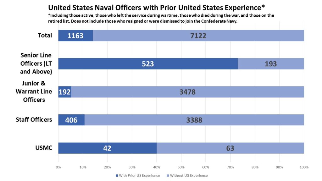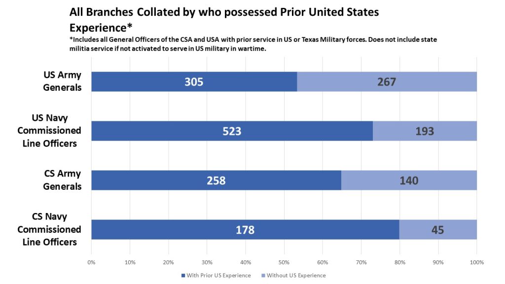 The smaller the organization, the larger percentage of its senior officers held antebellum US Government experience. This makes sense, as smaller organizations were more able to leverage their experienced officers into more leadership positions at lower levels of command. Conversely, the much larger US Army held the smallest percentage of senior leaders with antebellum US Government service, though logically that also makes sense considering the millions of volunteers inducted into the US Army in the conflict. As the war continued, volunteer officers slowly gained the needed experience to keep the US Army operating.
