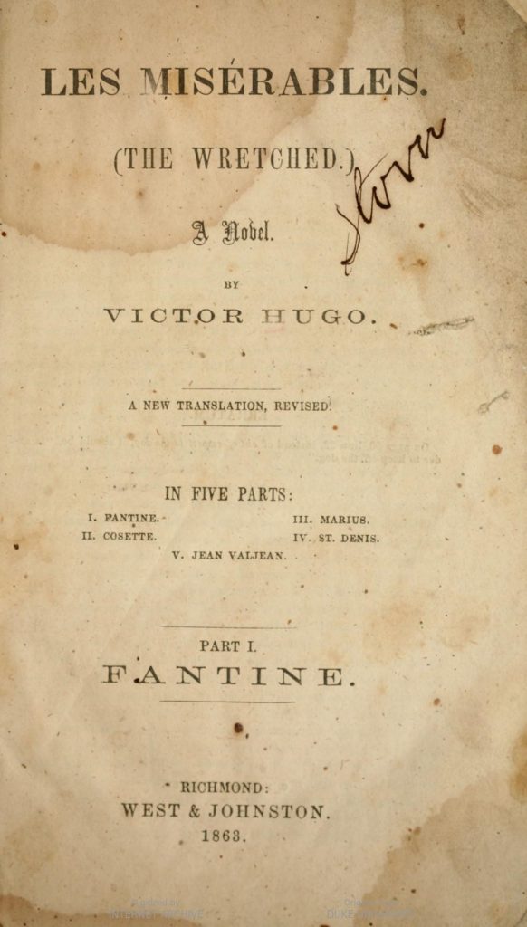 Hugo understood the political power of popular literature and used Les Misérables to trumpet his favorite cause: the poor and oppressed. He was an outspoken critic of slavery, penning a letter to Virginia’s governor, urging him to spare the life of John Brown. Southern printers, still smarting from Harriett Beecher Stowe’s Uncle Tom’s Cabin a decade earlier, deleted passages denouncing slavery from Hugo’s narrative.[3]