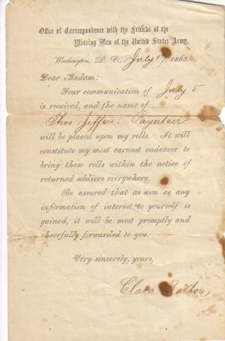 For example, when the wife of Thomas J. Payntar, 4th New York Calvary, wrote about her missing husband in July 1865, she received a response that his name “will be placed upon my rolls….Be assured that as soon as any information of interest to yourself is gained, it will be most promptly and cheerfully forwarded to you.”