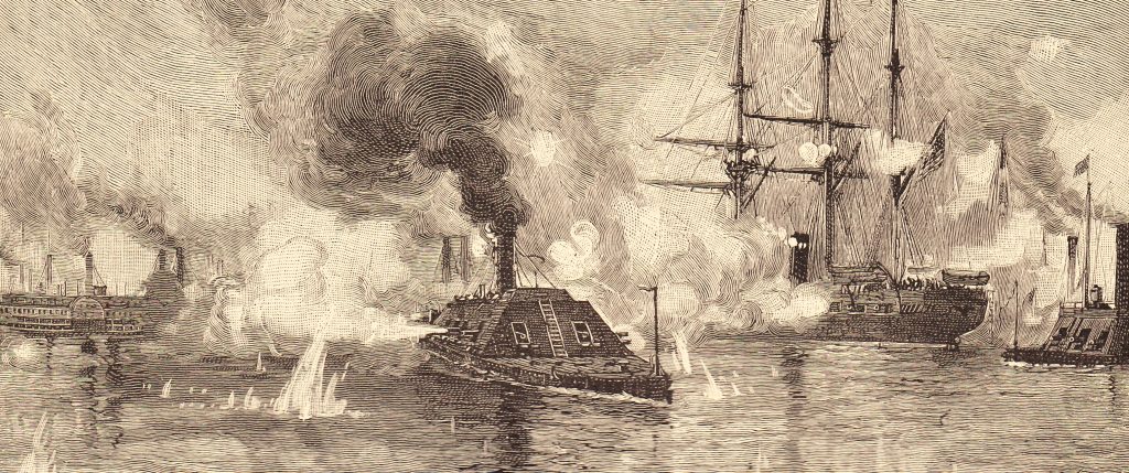 In the “Capture of New Orleans” lithograph, Admiral David G. Farragut’s flagship, USS Hartford, leads the column of warships past Fort St. Philip (obscured on the left in smoke and fire) and the ironclad CSS Louisiana. Tiny figures on both vessels fire musket and cannon. The Rebel tugboat Mosher pushes a flaming fire raft against Hartford’s port side while the cigar-shaped ironclad CSS Manassas approaches from the right.