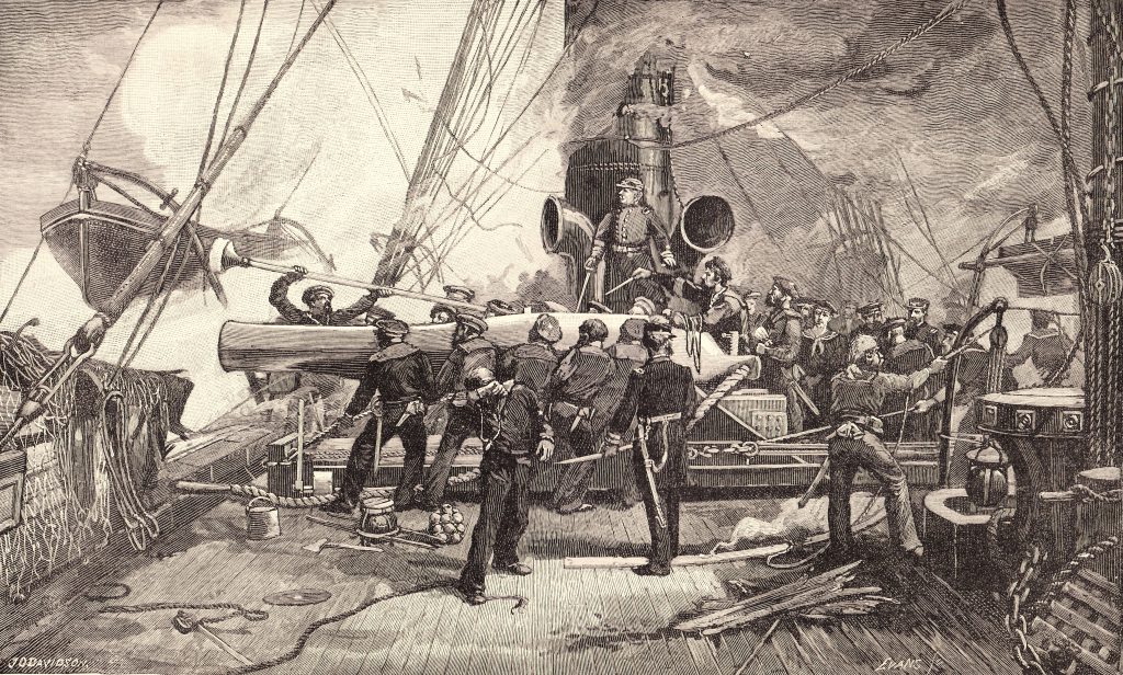 This one depicts the crew of USS Kearsarge firing their XI-Inch Dahlgren smoothbore in the engagement that sank CSS Alabama off Cherbourg France, June 19, 1864. (Click the image, open to full screen, and zoom to appreciate incredible detail.)