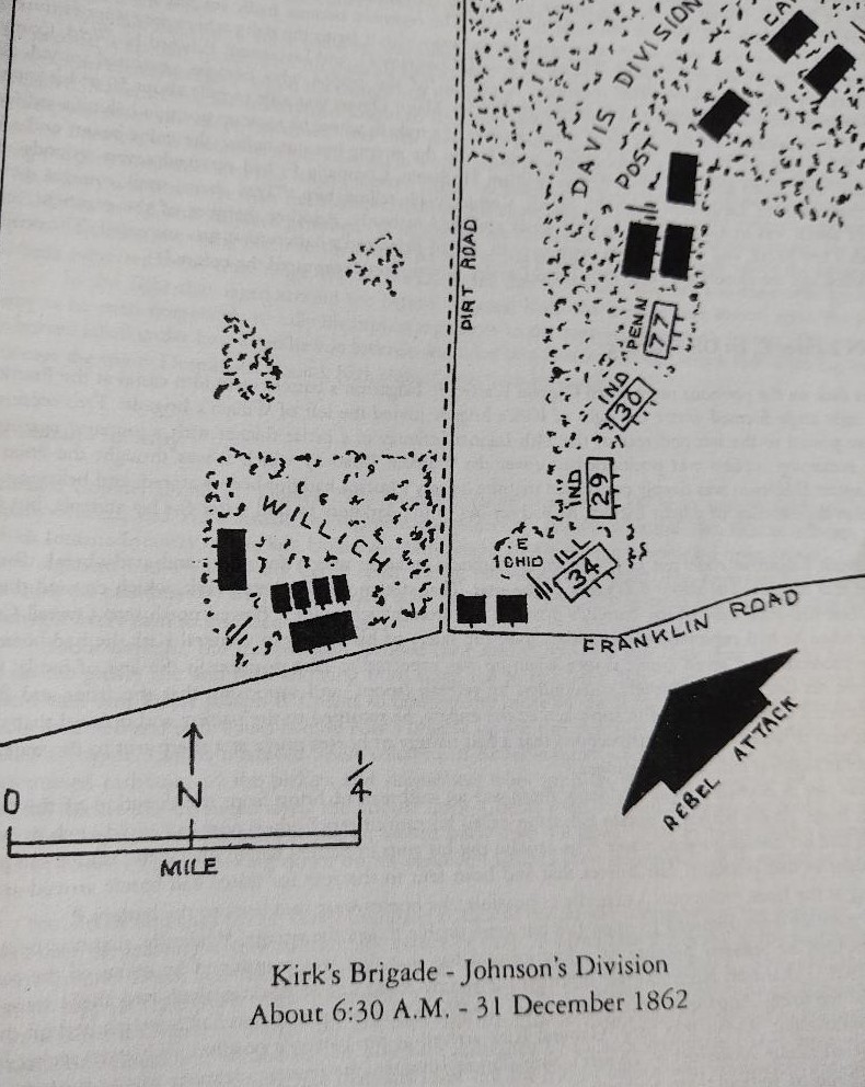 Hi Kevin, No this is a modern map from the outstanding and very detailed book, The Stones River Campaign: The Union, by Lanny Smith. Willich is to Kirk’s right, Post is to their left. The Union troops are facing southeast, or to the right, as you look at this map. Willich was overrun quickly, bearing the worst of the Confederate attack. Hope this helps!