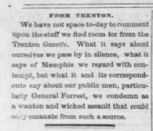 In 1874, Forrest again demonstrated his changing attitudes when racial violence broke out in Trenton, Tennessee. Although Forrest and other Democrats placed overall blame on the Black population, they argued that the irresponsible actions of white vigilantes threatened to prolong Federal intervention in the South.[12] Forrest allegedly said that if he “were entrusted with proper authority he would capture and exterminate the white marauders who disgrace their race by this cowardly murder of negroes.”[13] In a letter to Tennessee Governor John C. Brown, he also offered to lead a party to hunt down and punish the riders, but the governor declined.[14]