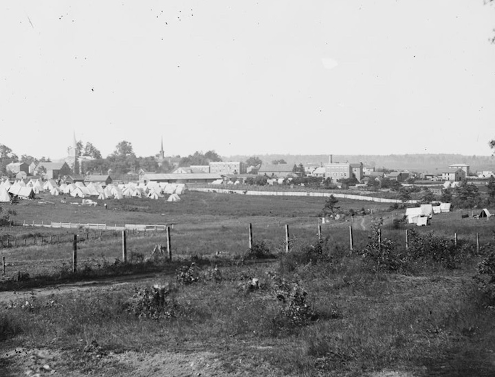 The town of Culpeper is visible in this Timothy O’Sullivan photograph taken in November 1863. The future Culpeper National Cemetery site is visible across the image, from near the train depot (long single story structure), across the open ground to the foreground and small rise on the right, where the Officer’s Circle is today. (Library of Congress)