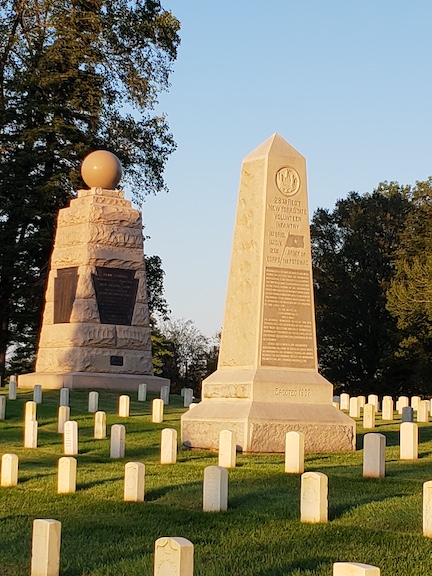 The 28th New York Infantry monument (in the foreground) dedicated in 1902 and in the background is the monument to all Pennsylvania soldiers (1912) who died in the region during the war are placed among their comrades who fell during the Civil War. (photo by Michael Block)