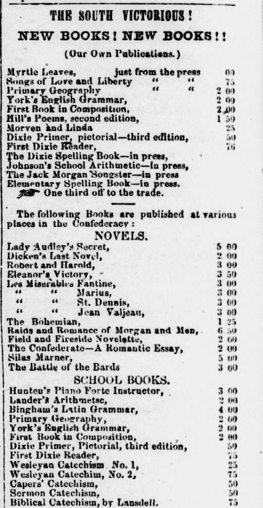 Newspapers such as this advertised for books, including school texts, that pushed a pro-Confederate agenda. (Weekly Confederate, Raleigh, NC, June 15, 1864