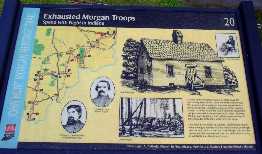 A missed opportunity for the Union also occurred near Sunmansville. Morgan and a bulk of his men encamped and bedded down for the night not 3 miles outside of the small town. Morgan even established his headquarters for the night in a one room schoolhouse. As Morgan slept on the schoolhouse floor, Union General Lew Wallace arrived by rail with several hundred men in Sunmansville. Wallace was unaware of the 2,500 raiders less than three miles away. When the sun rose on Monday, July 13, the rebels already trotted east toward the Ohio border. Still unaware of their lost chance, Wallace and his soldiers climbed aboard railroad cars, heading south toward Lawrenceburg.