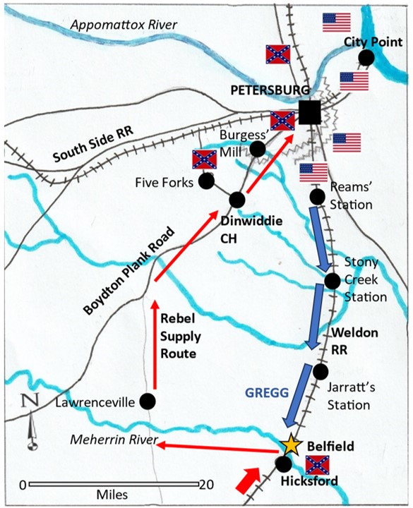 f) Even by some miracle if Gregg had captured (temporarily, as you correctly point out) Belfield, any supplies the Rebels had there would be safely stored on the Rebel side of the river at Hicksford; as Meade pointed out.