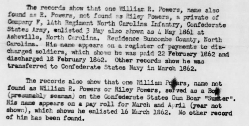 Edward F. Witsell to Ruffner Jones, August 24, 1950, William R. Powers, 14tC NC Infantry, Carded Records Showing Military Service of Soldiers Who Fought in Confederate Organizations, compiled 1903 – 1927, documenting the period 1861 – 1865, M270, RG 109, US National Archives.