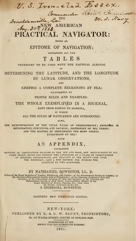 [7] Nathanial Bowditch, The New American Practical Navigator (New York: E. & G.W. Blunt, 1861), copy available for view at https://archive.org/details/newamericanpract00bowdrich/page/n5/mode/2up.