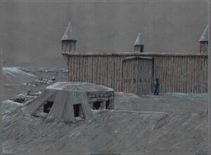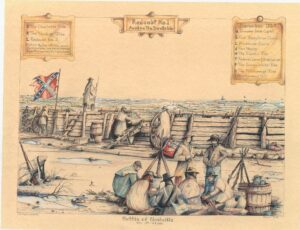 Philip Duer’s depiction of Fort Negley shows it during the winter storm that engulfed the armies and prevented George Thomas from attacking for a few days. Here a lone USCT sentry tries to survive the cold. This is likely his best painting, as it relies on his strengths as an artist.