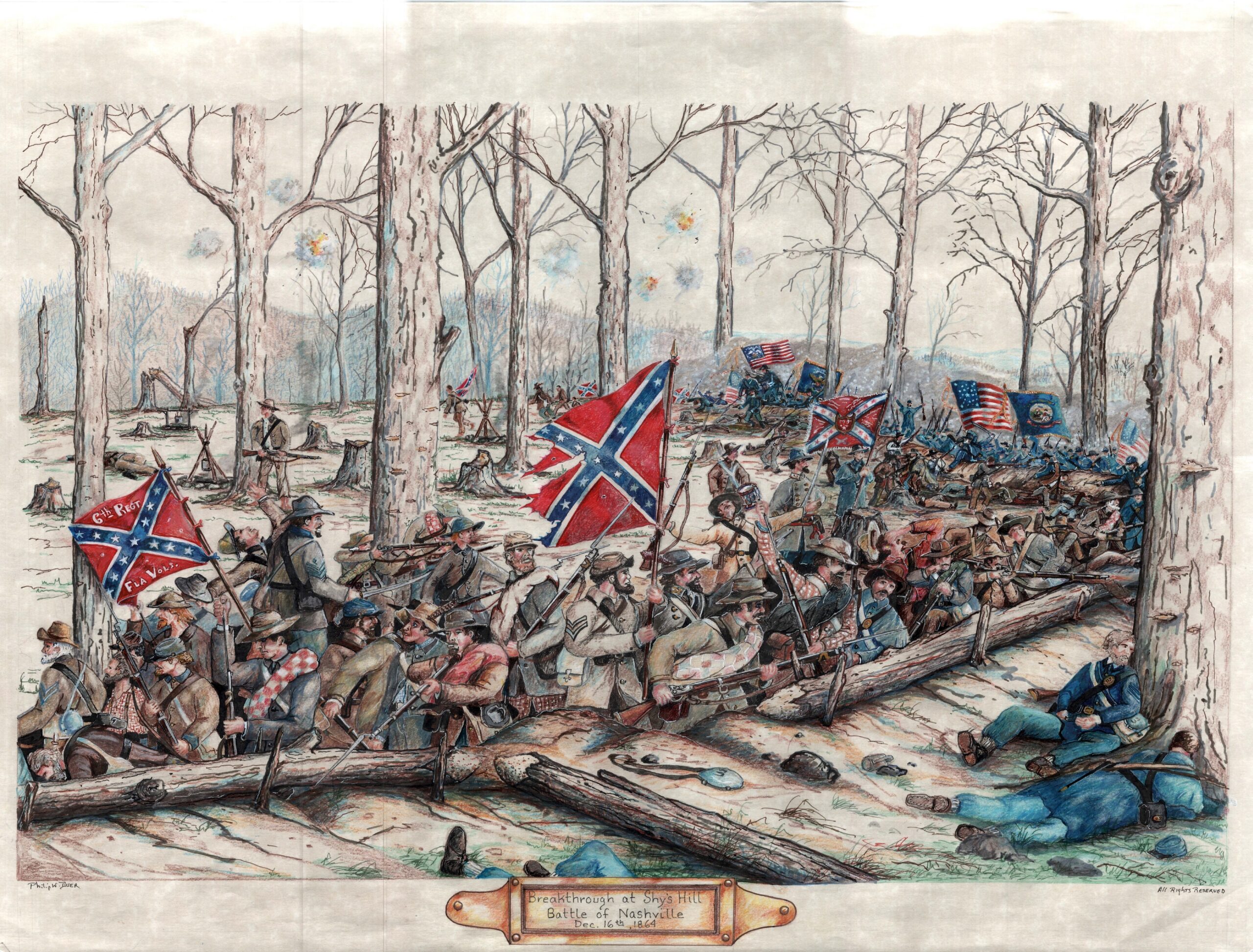 Philip Duer’s Breakthrough at Shy’s Hill shows the Florida Brigade just before it collapsed on December 16 at what was then named Compton’s Hill. What is interesting is the Rebels we see in the foreground are holding and look defiant. Behind them, their comrades are collapsing under pressure. Not too many paintings do this, and for that alone I like this one.